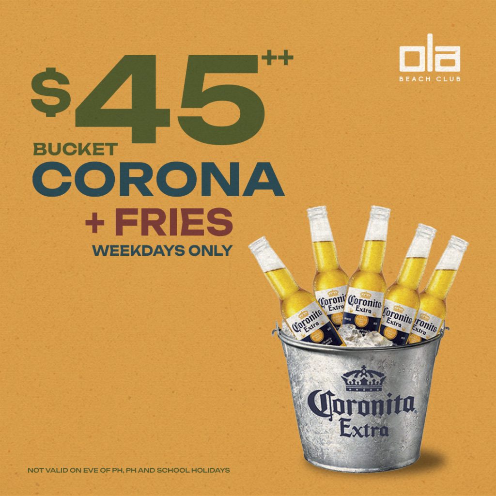 Enjoy a $45++ Corona bucket with fries and soak in the beach vibes.